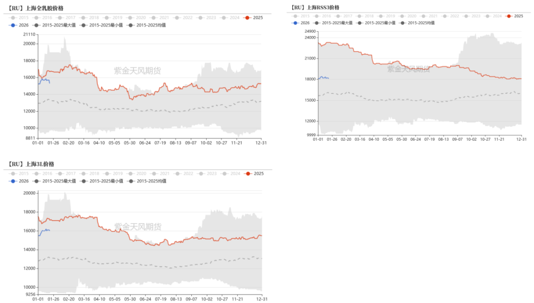 截至1月20日,上海全乳胶现货价格为15300元/吨,较上周-500元/吨;上海RSS3现货价格为18100元/吨,较上周-200元/吨;上海3L现货价格为16000元/吨,较上周-100元/吨。