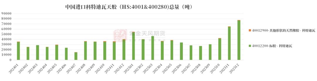 12月进口科特迪瓦天胶环比+19.17%,同比+92.68%