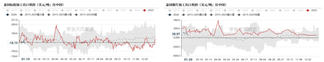 截至1月20日,泰混-RU价差为-870元/吨,较上周-100元/吨;泰混-NR价差为568.5元/吨,较上周+377元/吨。