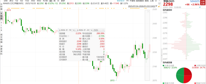 需求端支撑有限:MTO开工率84.36%,但部分装置检修预期压制需求;传统下游醋酸、甲醛开工小幅回升,但整体采购积极性偏弱,华北现货价2,070元/吨(1月23日),较期货贴水228元/吨。