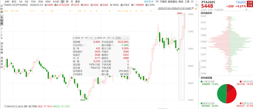 当周(2026.01.19-2026.01.23),PTA主力合约价格大幅上涨,持仓量显著增加,期现基差持续扩大。
