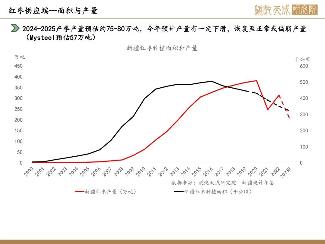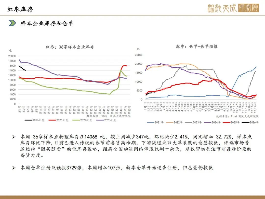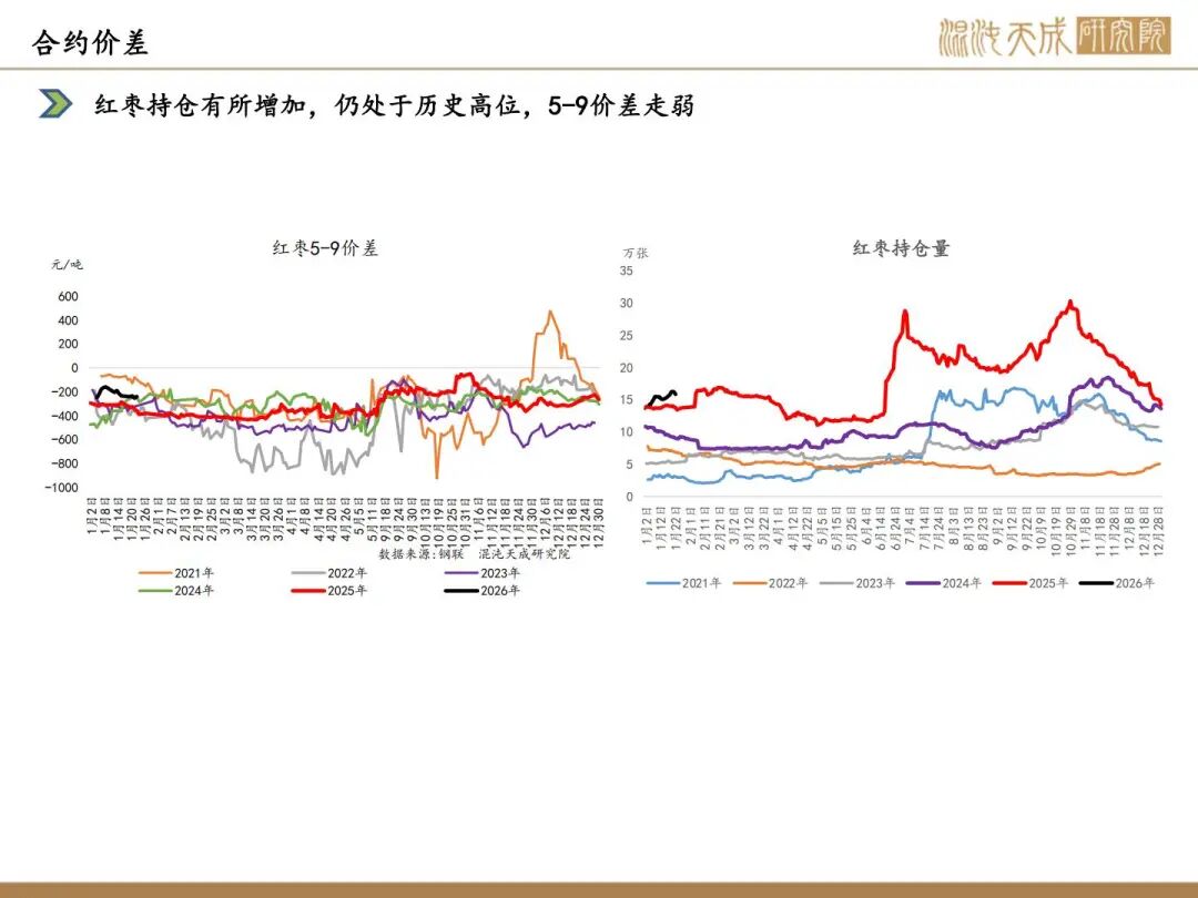 2025产季新疆灰枣产量在57.38万吨附近,较2024产季75万吨减少23.49%,叠加结转库存高,供应端宽松格局持续,今年中小户收购量较大,有利于消费端的走货,但是春节旺季备货即将过去,仍维持反弹逢高空的策略,关注消费端的变动。