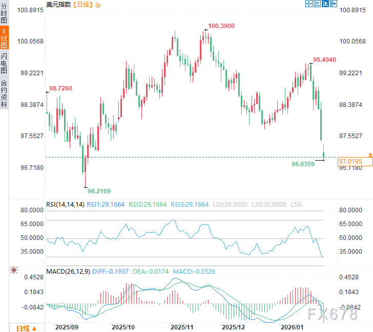 周一亚市时段,美元指数震荡下行,现交投于97.00附近,日内跌幅约0.45%,延续前两个交易日的显著下行趋势,一度触及96.94的超四个月新低。
