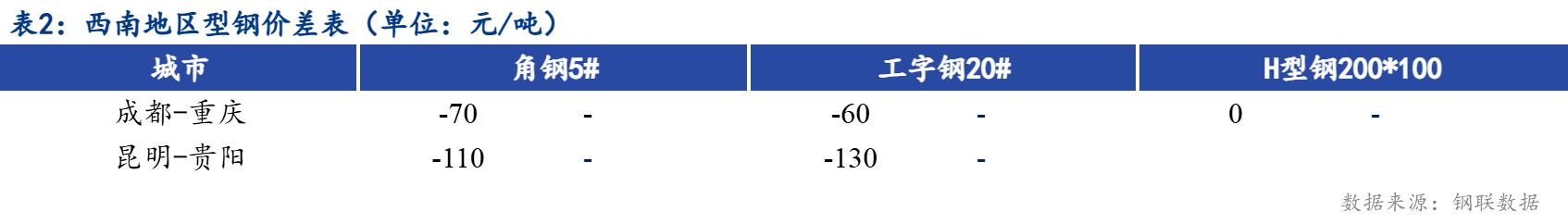 成都与重庆角钢价差不变,工字钢价差不变,H型钢价差不变;昆明与贵阳角钢价差不变,工字钢价差价不变