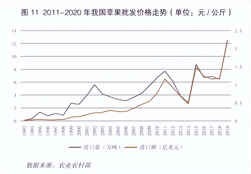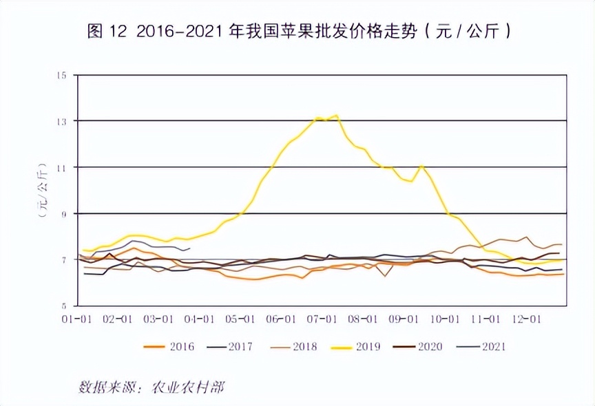 2.2017年至2019年间,止跌回升。该阶段,我国苹果批发价格由2016年的4.41元/公斤上涨至2017年的5.95元/公斤,2018年维持高位5.99元/公斤。主要原因为2017年果树生长期前旱后涝,部分产区产量下降,据国家统计局数据显示,2017 年山东苹果产量较2016年下降38万吨,甘肃减产49万吨,河北减产138万吨,产量下降,出口量增加,进口量下降,促使价格上涨,2018 年花期发生严重冻害,产量下降,对价格形成支撑,维持高位。
