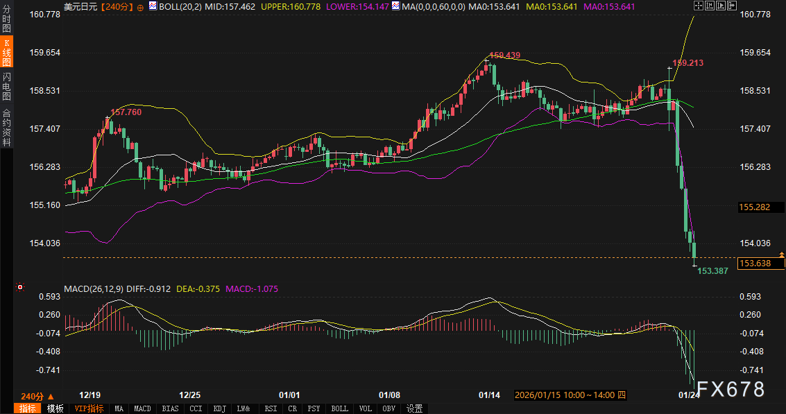 从美元兑日元240分钟K线图观察,本轮下跌在技术上具有突破性意义。价格在短时间内连续跌穿多条重要均线,并一度击穿布林带下轨(当时位于154.160附近)。MACD指标迅速转负,且柱状线加速向下发散,表明下跌动能强劲。