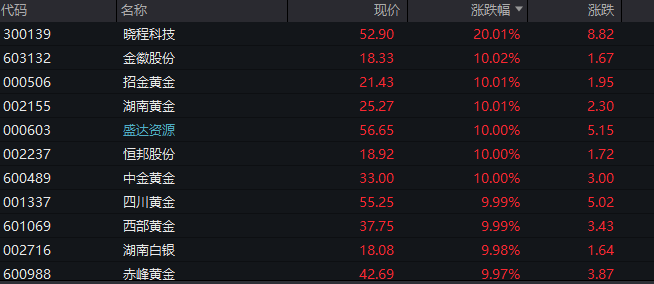 今日盘中,有色金属板块整体走强,贵金属板块掀起涨停潮。湖南黄金、招金黄金、中金黄金等十余只个股涨停。小金属、工业金属等相关板块表现活跃,紫金矿业、洛阳钼业、江西铜业、中国铀业等龙头股大涨。