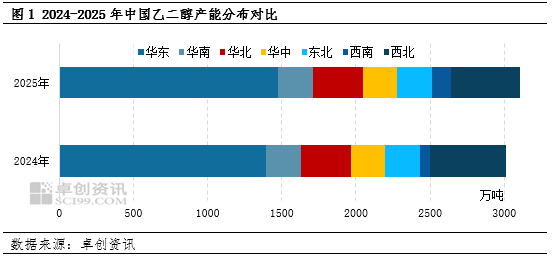 本轮乙二醇行业产能的快速扩张,核心驱动力来自两方面:一是合成气工艺的商业化落地与规模化推广,近五年来投建的合成气制乙二醇装置单套规模由早期的20万吨/年提升至60万吨/年,依托内地丰富的煤炭资源,内地大型煤制乙二醇项目投建速度明显加快。二是沿海炼化一体化项目配套乙二醇装置的集中投放。从工艺结构看,合成气(煤)制乙二醇2025年产能占比已提升至39.85%,乙烯制乙二醇产能占比在60.15%。从地区分布来看,华东地区依托下游聚酯产业链集聚、港口物流便捷等优势,仍然是乙二醇产能核心区域,2025年华东地区乙二醇产能占全国总产能的46.79%,华东地区乙二醇工厂主要为镇海炼化、盛虹炼化、浙石化等炼化一体化配套装置,相较合成气制乙二醇工厂,其靠近下游聚酯工厂,拥有较好的距离优势,单套装置规模普遍达到80万-100万吨/年,其规模效应突出。