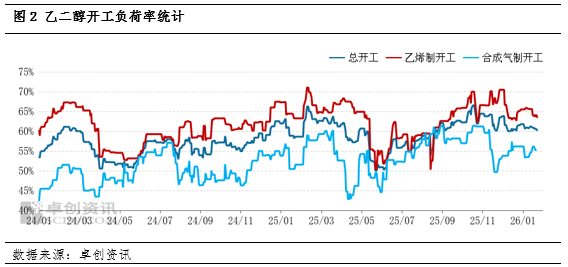 合成气制乙二醇的成本优势,则高度绑定煤炭价格走势。其整体成本受煤价波动影响极大。在鄂尔多斯Q5500动力煤价格处于525元/吨的当下,煤制乙二醇成本大概在3675元/吨,相较当下油制乙二醇4230元/吨(乙烯计算)附近的成本,煤制乙二醇成本比油制路线低13%左右;但在前一轮2021年高煤价周期中,当煤炭价格快速攀升阶段,煤制路线的成本优势便彻底消失,甚至出现原料供应稳定性受到冲击的情况,此时煤制乙二醇工厂竞争力大幅度下降。天然气基合成气制乙二醇工厂也面临同样问题,一方面受制于天然气价格季节性波动带来的成本增加影响,另一方面也面临供暖期期间工业用气稳定性因素对装置运行的冲击。2025年,中国合成气制乙二醇月均开工负荷率在58.3%,明显低于乙烯制的63.64%,不少缺乏原料资源配套的中小型合成气制乙二醇装置,其外采煤炭成本较高,竞争力不足,导致装置长期处于停产状态。