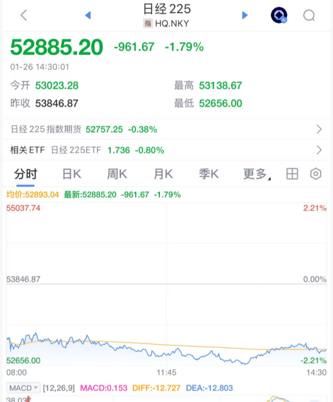 1月26日,日本股市突然大幅度下跌,收盘下跌961点(1.79%),报52885.2点。