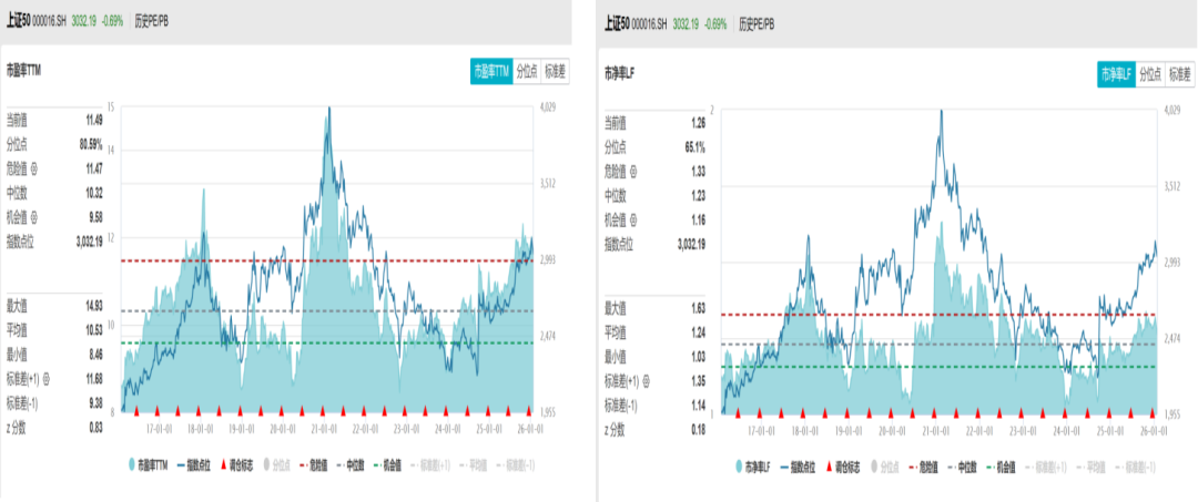 上证50PE十年以来分位点80%,PB分位点65%,处于历史中高位。