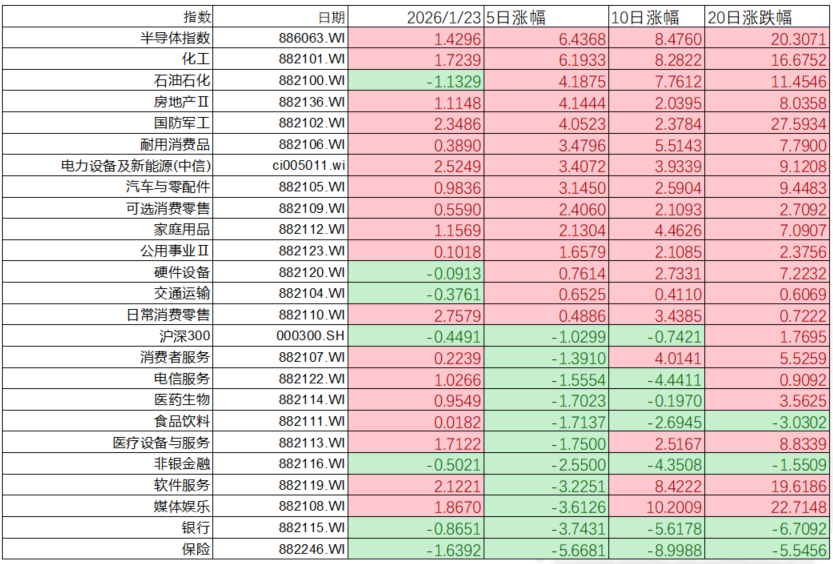 上周市场行业表现上半导体、化工、石油石化、房地产、军工等板块领涨,银行、保险、媒体等板块领跌。