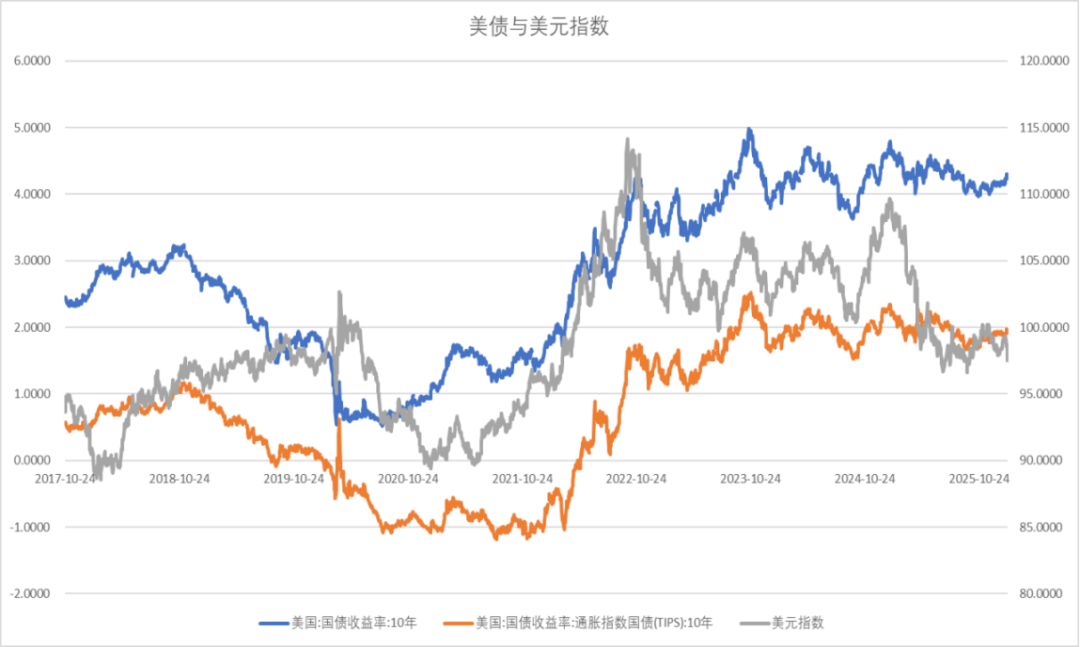 美十年期国债利率反弹、实际利率维持横盘震荡,美元再度下跌。