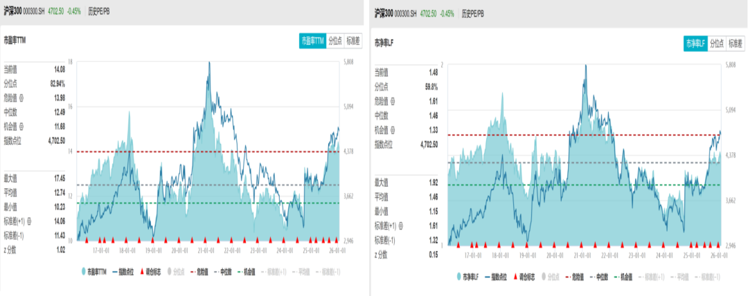 沪深300PE十年分位点83%,PB分位点60%,处于中高位。