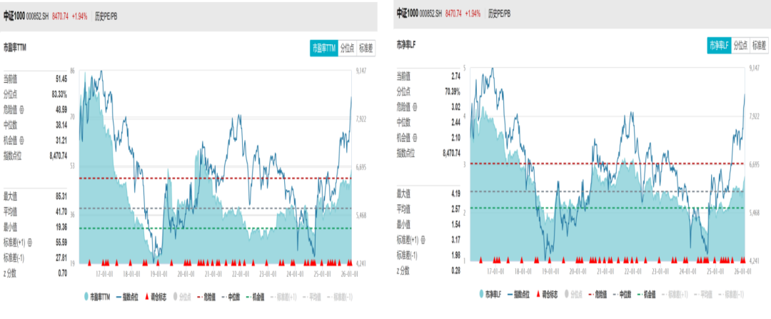 中证1000PE注册制改革以来分位点83%,PB分位数70%,估值中位。