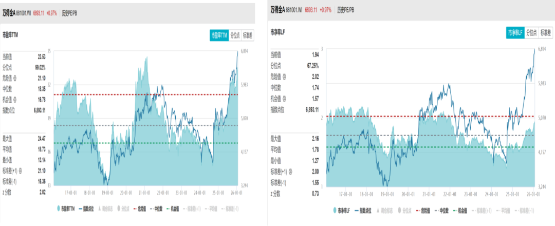 万得全A注册制以来估值PE分位数99%,PB分位数67%,处于中高位的水平。