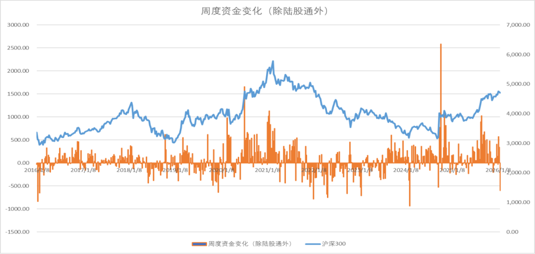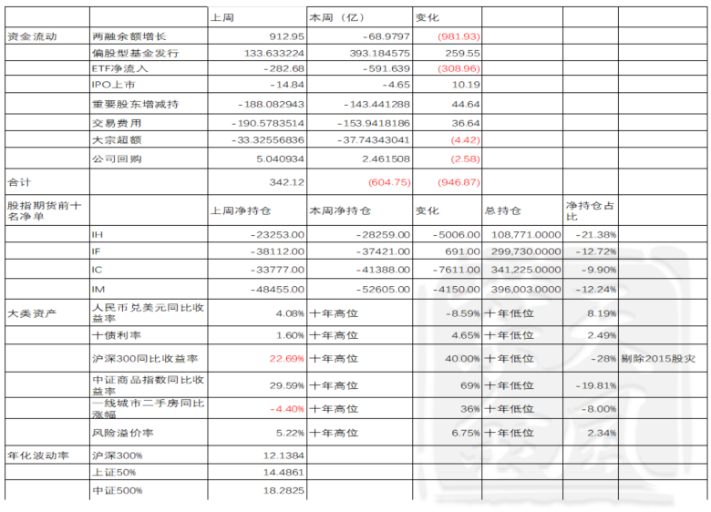 上周资金显著流出状态,融资余额转为流出,ETF大幅流出,产业股东减持处于较高水平,偏股型基金发行流入大幅增加,公司回购处于低位,大宗交易维持稳定。