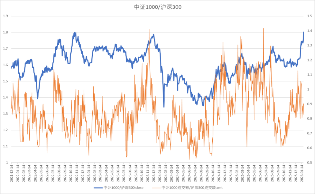 中证1000与沪深300的比值处于高位,成交量占比中性。