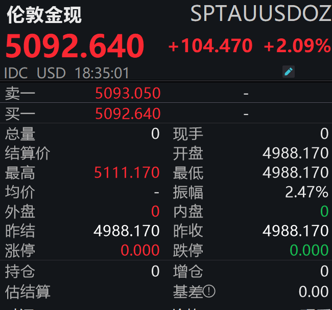 现货黄金接连突破5000美元、5100美元两大整数关口,日内大涨超110美元,最高触及5111.17美元/盎司,创下历史新高。
