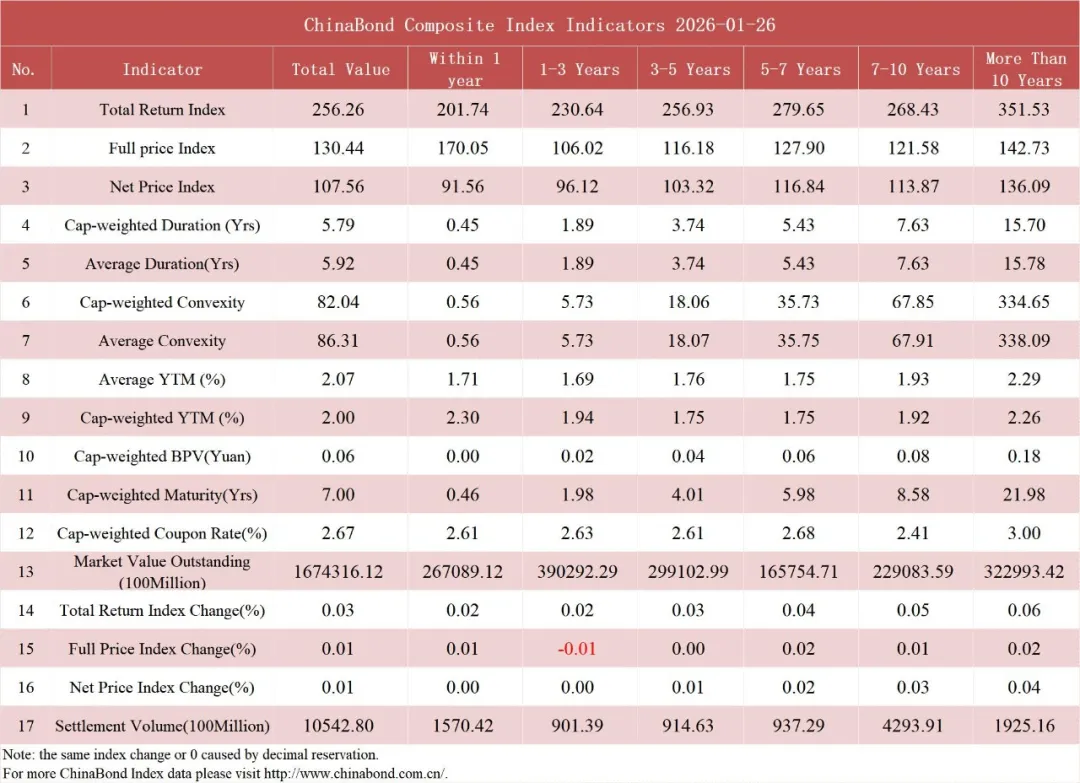 Treasury Futures On January 26th, TS2603 went down by 0.02% to 102.392, the yield went up by 1.72BP to 1.3867%; TF2603 went down by 0.02% to 105.850, the yield went up by 0.84BP to 1.5468%; T2603 went down by 0.02% to 108.180, the yield went up by 0.30BP to 1.7011%; TL2603 went up by 0.20% to 112.510, the yield went down by 0.87BP to 2.3125%.