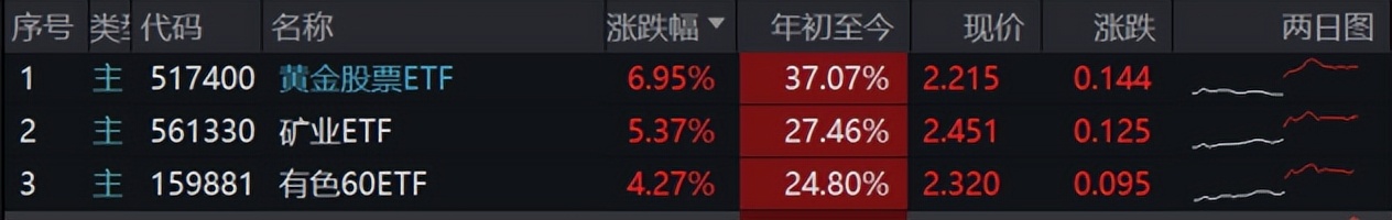现货黄金价格首次突破5100美元/盎司整数关口,黄金、有色金属板块大涨。黄金股票ETF盘中涨幅最高触及9.03%,矿业ETF盘中涨幅最高触及6.45%。