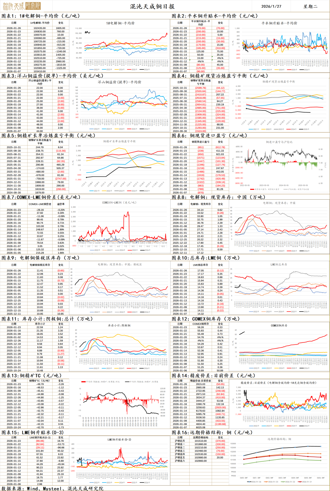1.【特朗普称提高对韩国多种商品关税税率至25%】SHMET01月27日讯,当地时间1月26日,美国总统特朗普在其社交平台“真实社交”发文表示,由于韩国国会未批准并落实此前与美国达成的贸易协议,美方将提高对韩国商品征收的关税税率。特朗普称,韩国立法机构“未能履行与美国达成的协议”,称该协议是其与韩国总统李在明于2025年7月30日达成,并在其2025年10月29日访韩时再次确认。特朗普表示,鉴于韩国方面尚未通过该项“具有历史意义的贸易协议”,他已决定将对韩国汽车、木材、制药产品以及其他对等关税项目的税率从15%上调至25%。(央视)