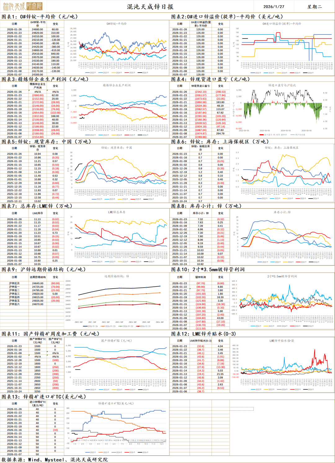 供给端,中国2025年12月锌矿砂及其精矿进口量为21万金属吨,同比+1.1%。国产矿四季度产量环比下行,国产锌精矿TC低位持平,矿端供应仍偏紧,12月产量环比下行,据钢联调研,1月冶炼厂排产环比回升。日本三井锌冶炼厂因地震停产,涉及产能11.2万吨,持续跟踪。