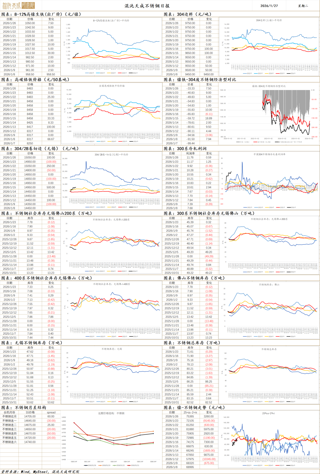 1、【奥托昆普上调2月份不锈钢合金附加费】2026年1月25日综合外媒消息,鉴于主要不锈钢牌号原材料成本普遍上涨,奥托昆普(Outokumpu)宣布上调2026年2月不锈钢板材产品的合金附加费。具体调整如下:304(EN 1.4301)系列:合金附加费上调至 2,118欧元/吨(2,504美元/吨),较上月环比大幅上涨 199欧元/吨(235美元/吨)。316L(EN 1.4404):合金附加费上调至 3,482欧元/吨(4,116美元/吨),环比显著上涨 303欧元/吨(358美元/吨)。430(EN 1.4016):合金附加费微调至 1,017欧元/吨(1,202美元/吨),环比小幅上涨 2欧元/吨(2美元/吨)。(51bxg)