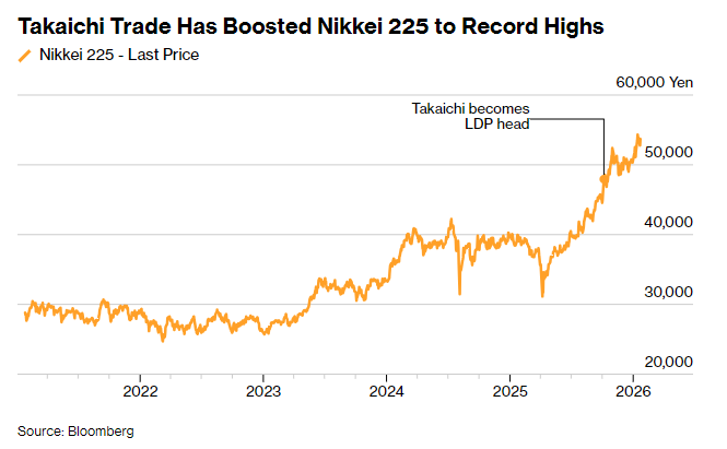 交易员普遍押注,此次大选将进一步巩固高市早苗的执政授权,使其更有底气推进后续经济刺激举措。从整体市场逻辑来看,这一以她命名的交易策略,核心是做多股市、看空日元,同时押注债价下跌、收益率上行。