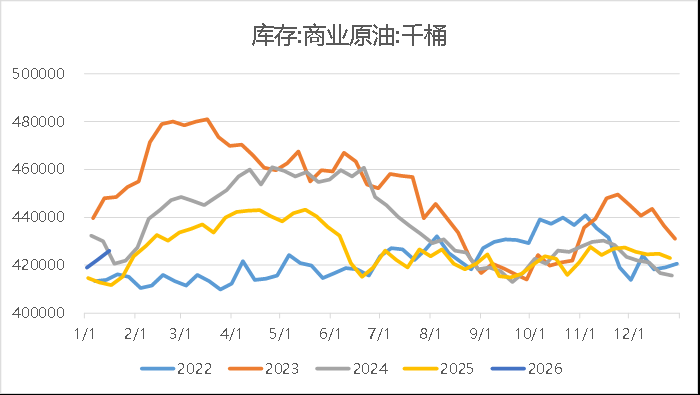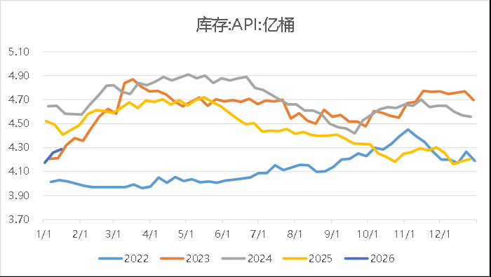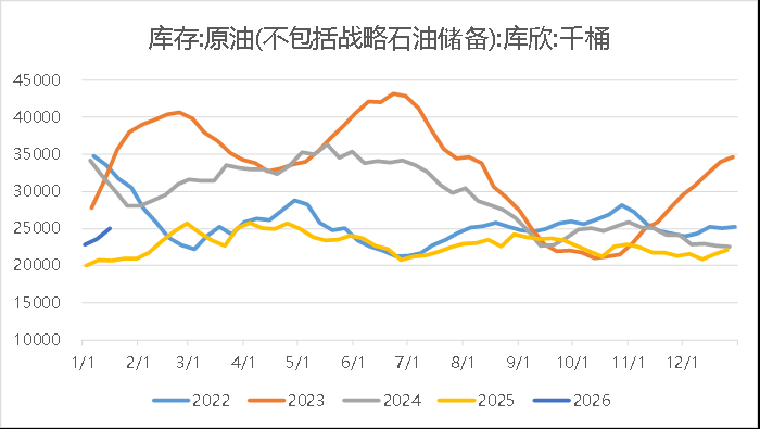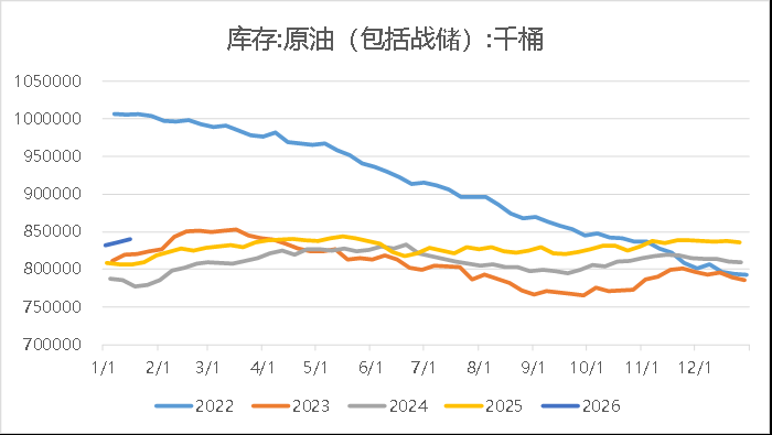 美国EIA(能源信息署)发布的原油库存数据,尤其是商业原油库存(Commercial Crude Oil Inventories),是全球原油市场最重要的高频基本面指标之一。周度来看,美国原油(包括战储)库存、商业原油库存以及库欣地区原油库存均出现了季节性累库趋势,累库预期开始兑现,且一般来说,2月开始成品油需求进入全年低谷,炼厂春季检修也陆续集中启动,原油价格将对库存变化更为敏感。