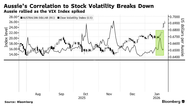 不断扩大的利差还推动澳元走势与股市波动脱钩。汇编数据显示,上周澳元与股市波动率指数的30天负相关性降至去年10月以来的最低水平。