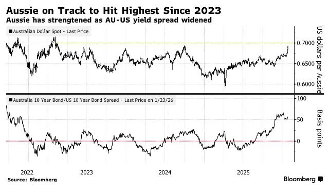 2026年以来,澳元兑美元汇率已累计上涨近4%,目前报约0.69,跻身今年迄今十国集团货币涨幅前三。澳大利亚联邦银行和西太平洋银行的策略师均预测,澳元有望在3月底前升至0.70,这一价位上一次出现还是在2023年初。