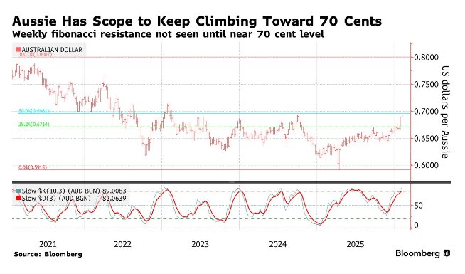 除宏观基本面外,交易员用于判断潜在支撑和阻力位的周线斐波那契回撤分析显示,澳元上探0.70几乎无明显阻力,同时其下跌空间或在0.67附近受到限制。