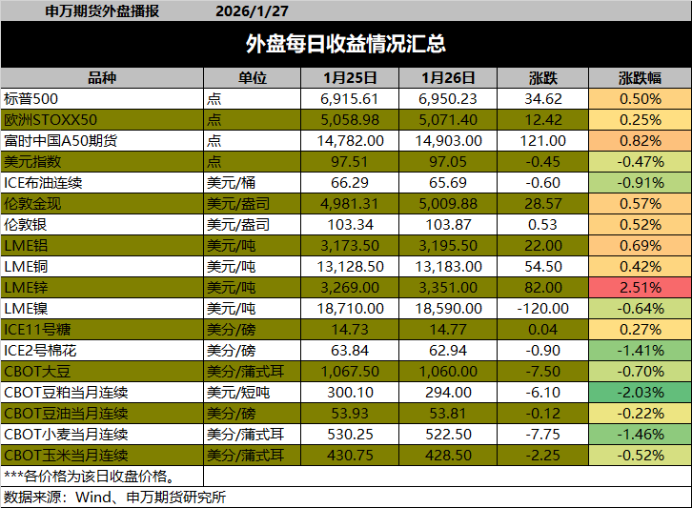 股指:美国三大指数上涨,上一交易日股指风格转换,权重股走强,有色金属板块领涨,国防军工板块领跌,市场成交额3.28万亿元。资金方面,1月23日融资余额减少14.02亿元至27061.41亿元。2026年以来股市的持续向好,是科技周期共振、政策红利释放、经济复苏向好与海外资金回流四大因素共同作用的结果。当前,市场已逐步从估值扩张主导转向盈利驱动的新阶段。我们预计2026年供给侧改革持续并将推升大宗商品的价格并带动资源型股票上涨。在“十五五”规划的战略指引下,随着各项政策效应的持续释放、经济复苏动能的进一步增强以及海外资金配置中国资产的进程持续推进,股市有望延续震荡上行的态势。
