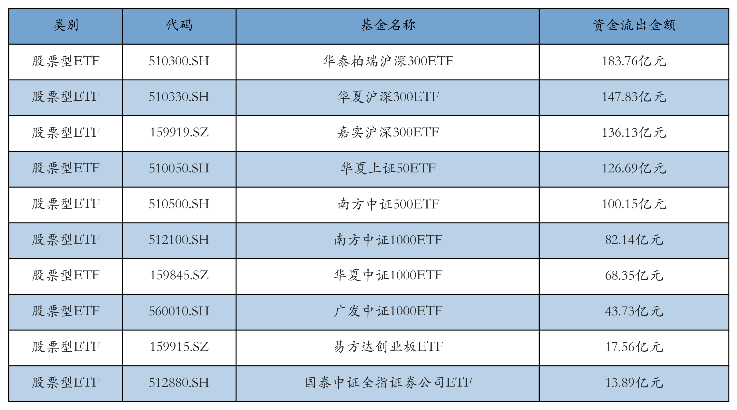 昨日股票型ETF资金流出最多的3只ETF及其流出金额分别为:华泰柏瑞沪深300ETF(流出183.76亿元)、华夏沪深300ETF(流出147.83亿元)、嘉实沪深300ETF(流出136.13亿元)。资金流出前10详情见下表: