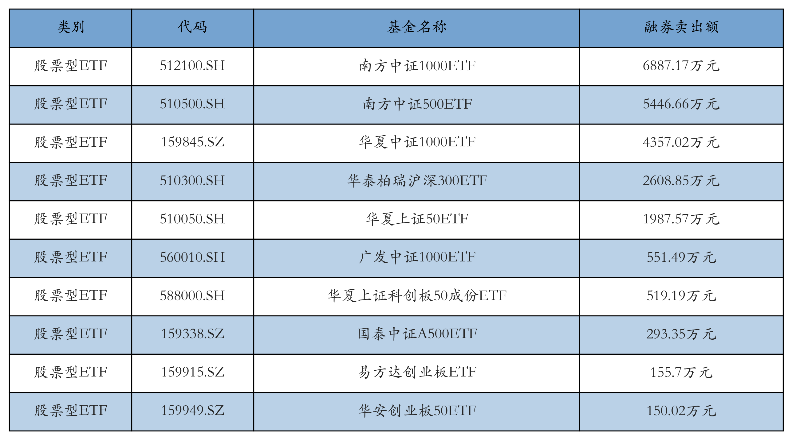 昨日股票型ETF融资卖出额最高的3只ETF及其卖出金额分别为:南方中证1000ETF(6887.17万元)、南方中证500ETF(5446.66万元)、华夏中证1000ETF(4357.02万元)。融券卖出额前10详情见下表: