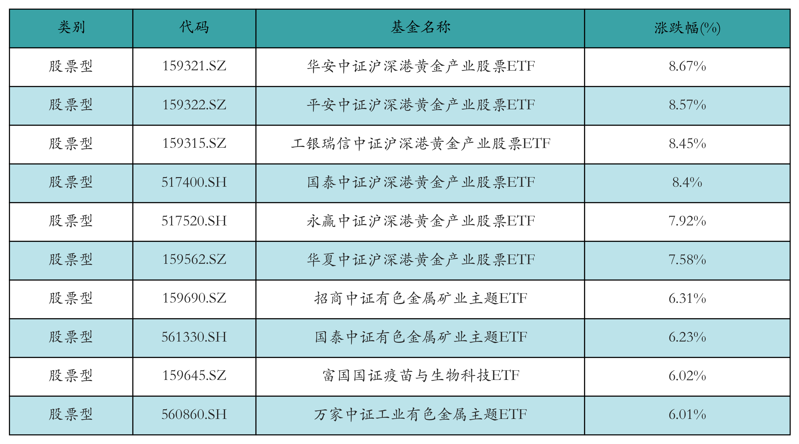 昨日股票型ETF涨幅最高的3只ETF及其收益率分别为:华安中证沪深港黄金产业股票ETF(8.67%)、平安中证沪深港黄金产业股票ETF(8.57%)、工银瑞信中证沪深港黄金产业股票ETF(8.45%)。涨幅前10详情见下表: