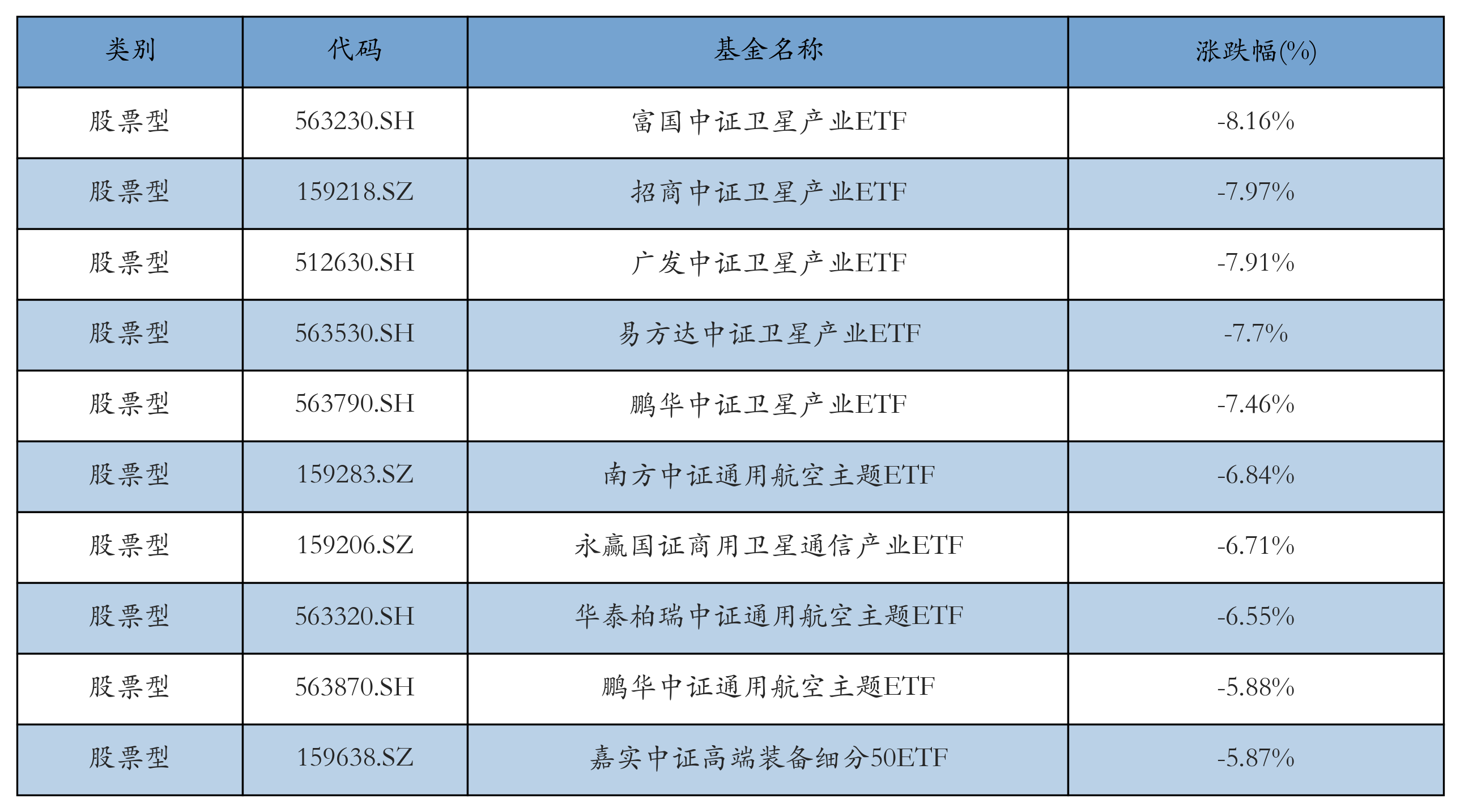 昨日股票型ETF跌幅最大的3只ETF及其收益率分别为:富国中证卫星产业ETF(-8.16%)、招商中证卫星产业ETF(-7.97%)、广发中证卫星产业ETF(-7.91%)。跌幅前10详情见下表: