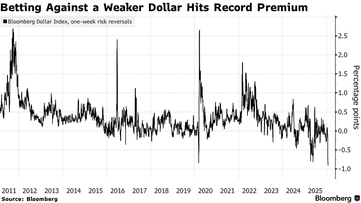 随着美国政治环境的高度动荡引发市场涌向看空对冲,美元交易员正以创纪录的成本押注美元将出现更深度的下跌。能够从美元走弱中获利的短期期权溢价已扩大至自2011年有数据以来的最高水平。看空情绪并不局限于短端——投资者对美元长期前景的悲观程度,至少已达到2025年5月以来的最高水平。尽管美元指数周二小幅走高,但其此前连续三个交易日的跌幅,为去年4月美国关税动荡以来之最。若跌势如期权价格所暗示的那样重新展开,美元可能跌至四年来的最低水平。