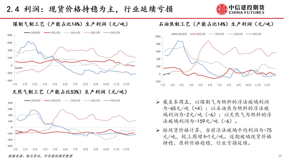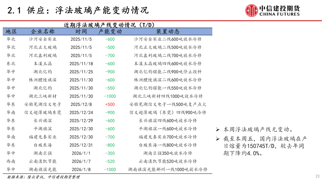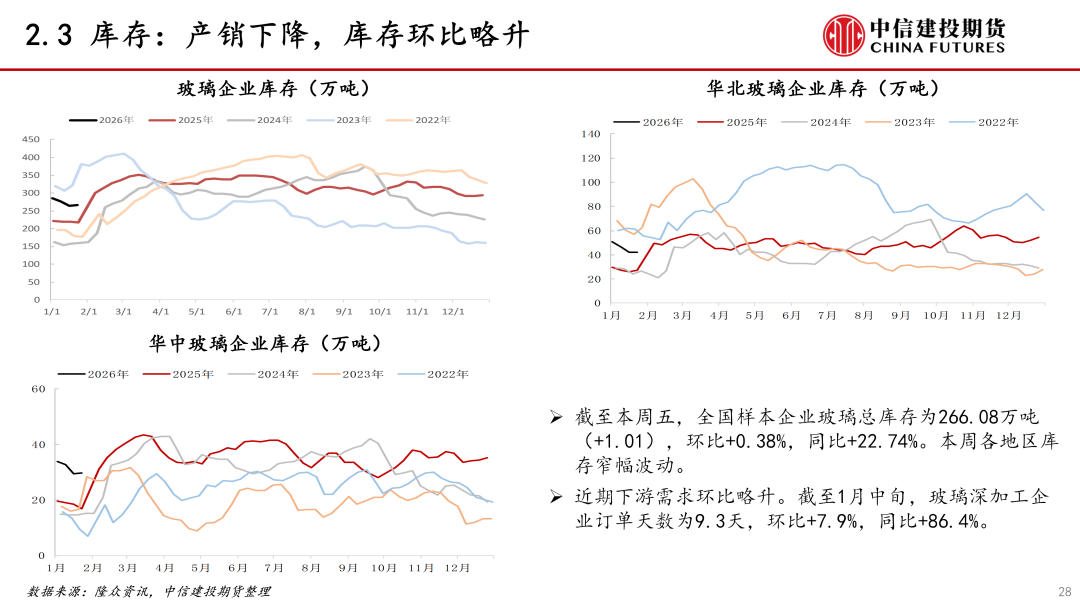 需求:本周玻璃需求偏弱。当前玻璃终端地产行业疲软,1-12月竣工面积增速下降约18%,1月上旬玻璃深加工订单环比略增。近期玻璃下游需求偏弱,投机需求变动不大,需求对价格影响偏中性。后期需持续关注地产政策落地情况和对竣工端玻璃的影响。