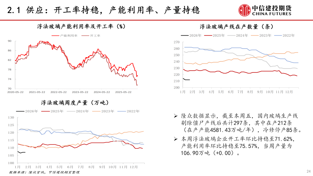 供应:本周玻璃供应持稳。本周玻璃产线无变动,产能利用率、产量环比稳定。近期玻璃供应小幅下降,日熔量同比下降约4.0%。短期玻璃供应环比持稳,供应端对价格影响偏中性。