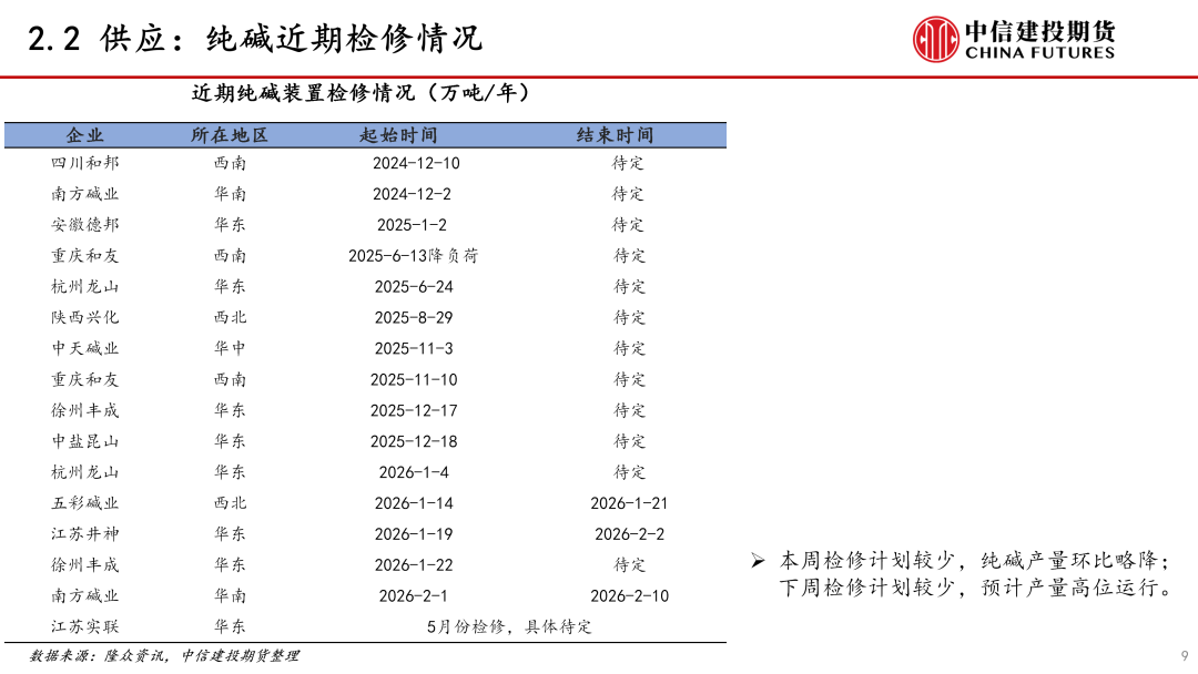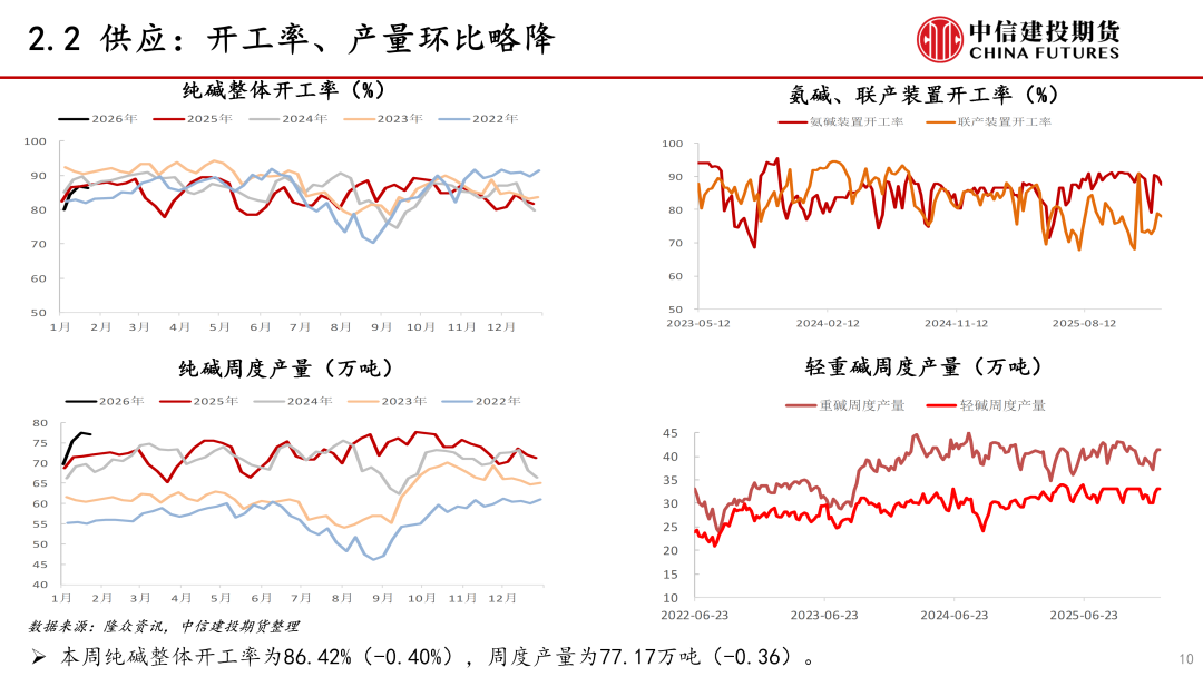 供应:本周纯碱供应环比略降。本周纯碱检修安排较少,产量环比略降。下周纯碱检修计划较少,预计产量高位运行。近期纯碱检修安排减少,新增产能投放,供应端压力较大。