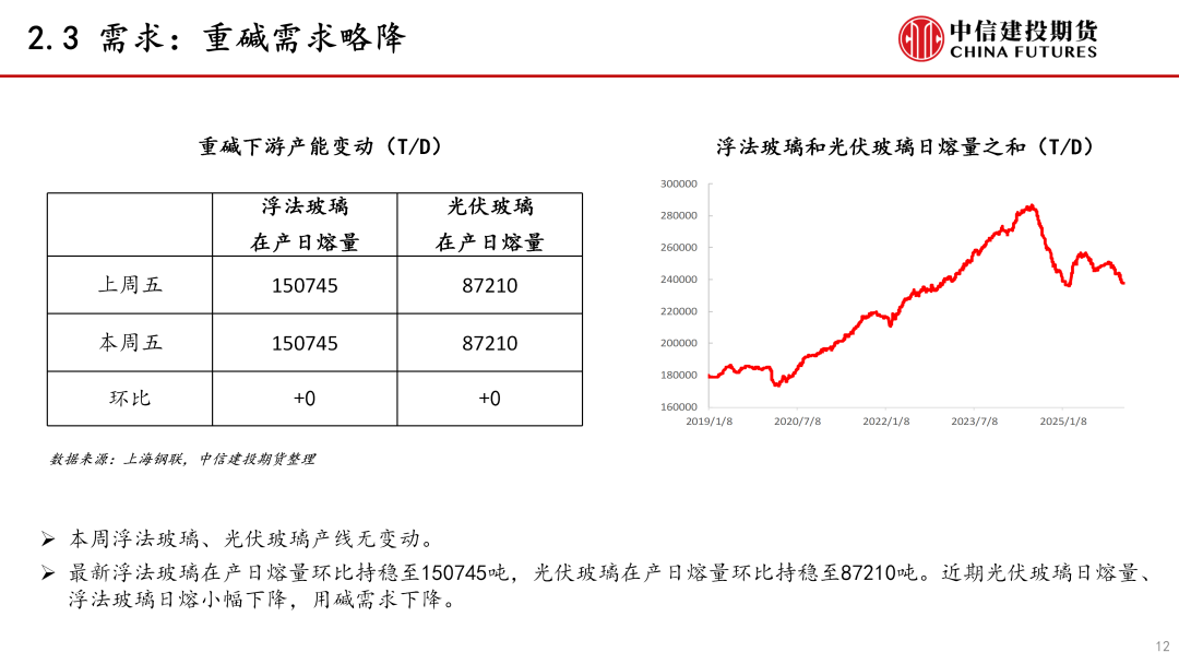 需求:本周纯碱需求略降。近期重碱需求下降,轻碱需求稳中略降。本周浮法玻璃、光伏玻璃产线无变动,近期浮法、光伏玻璃日熔量之和下降。短期中下游采购积极性一般,碱厂新订单略降。后期继续关注光伏玻璃和浮法玻璃产线变动情况。