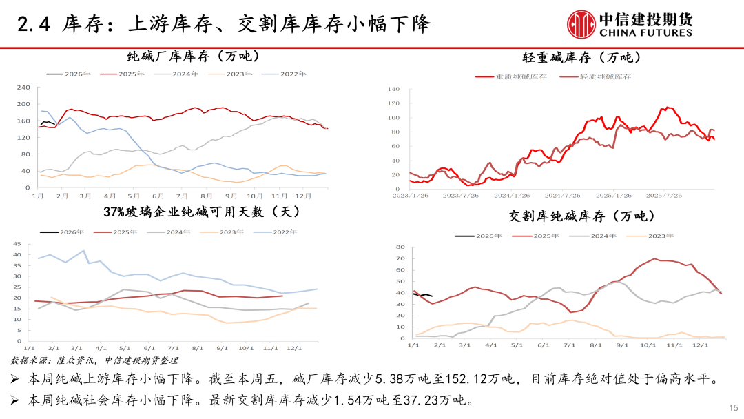 库存:本周纯碱库存小幅下降。本周纯碱生产企业库存、社会库存小幅下降,总库存小幅下降。当前纯碱供应过剩格局未改,预计下周上游库存小幅增加。