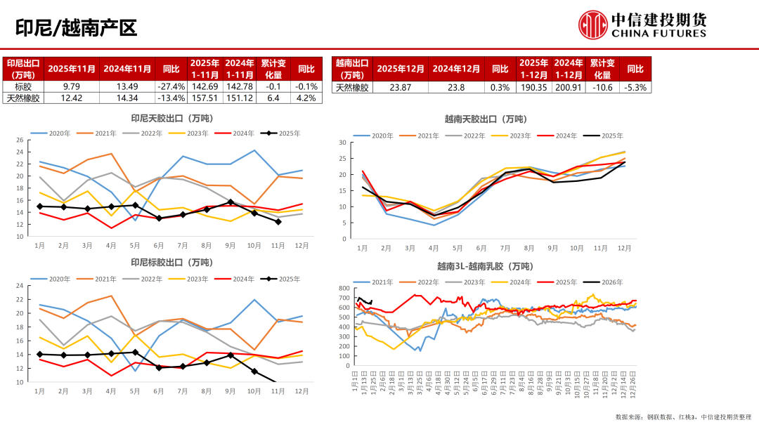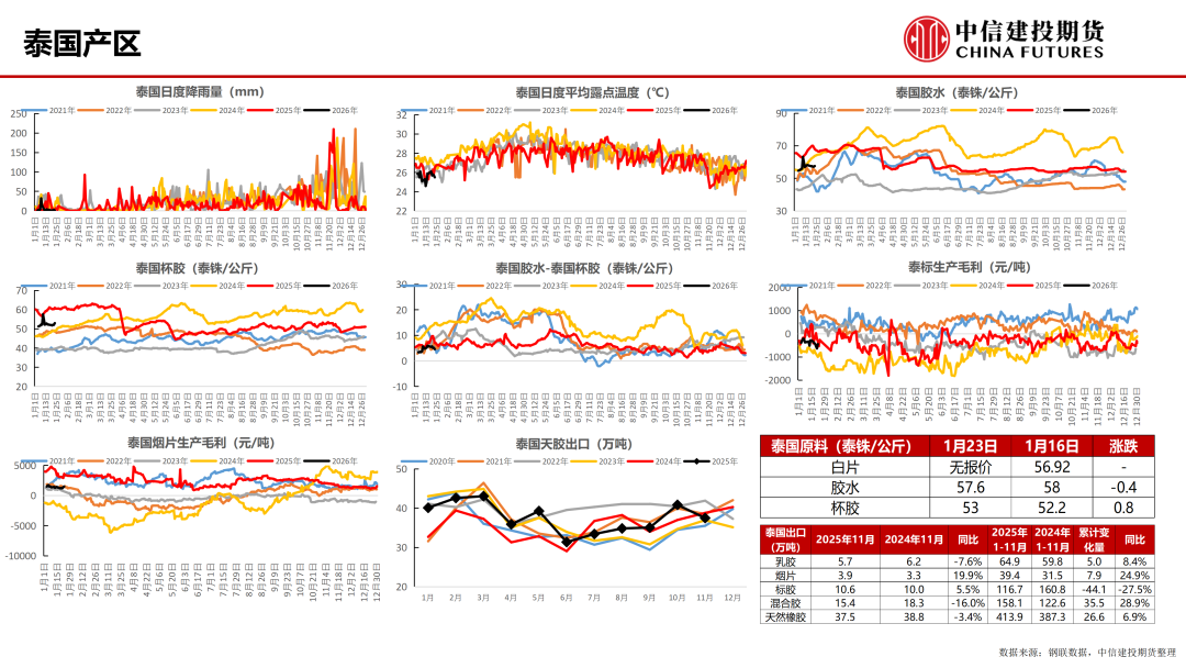 上游:本周,泰国北部橡胶树开始落叶,进入割胶尾声。泰东北部预计割胶至二月初附近,工厂日收胶量出现缩减趋势。截至1月23日,泰国胶水报收57.6泰铢/公斤,泰国杯胶报收53.0泰铢/公斤,水杯价差重回低位;印尼南部巨港(赤道南),部分胶树仍处于落叶期,北部棉兰(赤道北)进入旺产季;科特迪瓦即将进入低产季;本周越南产区天气情况尚可,受季节性因素影响,整体胶水产量较旺产季下降明显,原料胶水干含同步下滑,预计本月底将陆续停割,橡胶加工厂逐渐进入囤货储备阶段;国内云南停割;海南停割,当地整体浓乳冬储备货量较往年处于偏低水平。