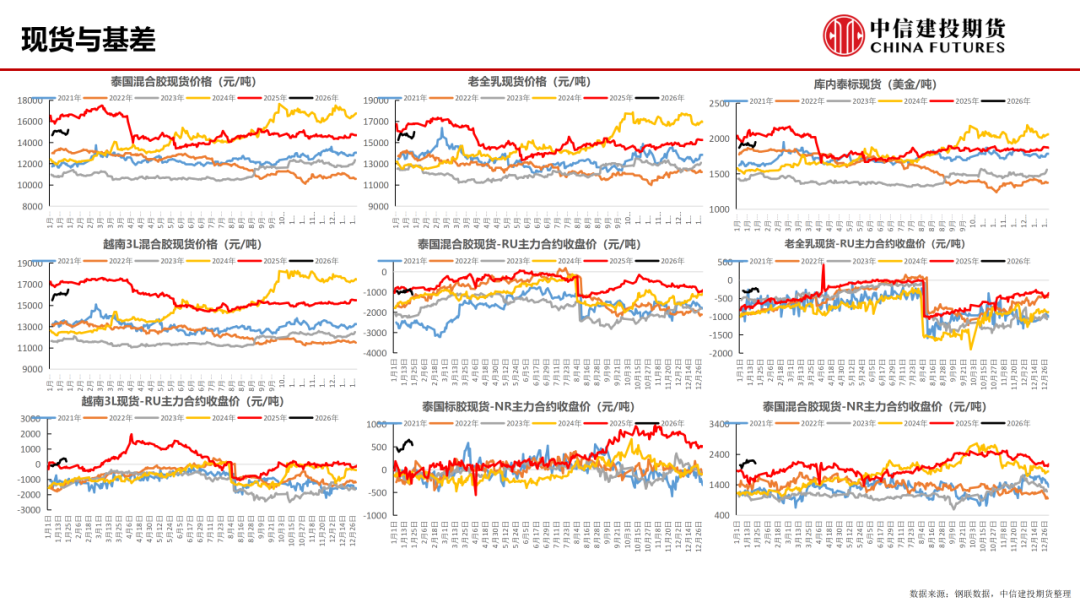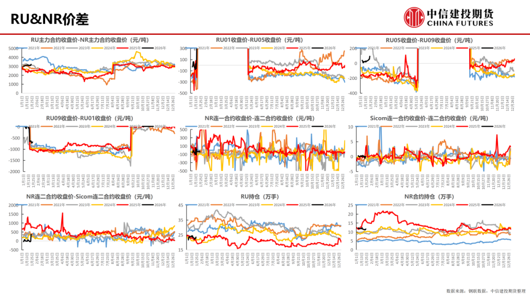 逻辑:随着北半球冬季来临,全球即将进入低产季,也代表着单边价格的定价框架将从供需平衡的动态定价转换至存量库存的静态定价,在近期商品市场预期全面走强的背景下,预计短期内RU&NR&Sicom仍将高位震荡。向后看,尽管认为2026全球轮胎等橡胶制品的需求将迎来温和增长,但是需求的增长是需要时间的,以及全球贸易壁垒仍未完全消除,需求增长的量级或仍然受限。因此,预计在2026年农历春节之前,本轮反弹行情的高度或不高于2025年7月底。