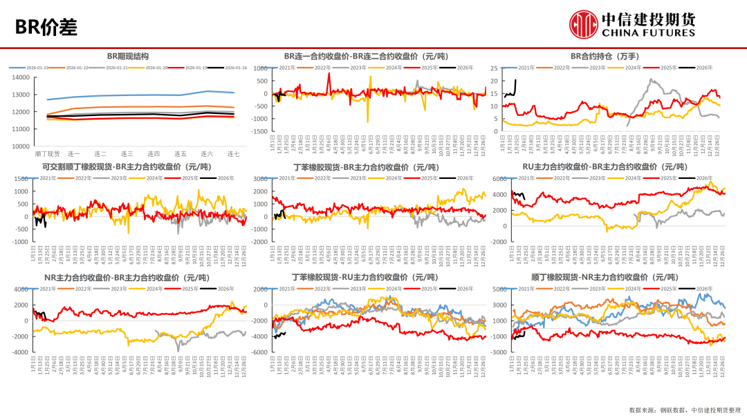 期货:本周,现货贴水BR2602合约-230元/吨,现货跟涨盘面;本周BR仓单为8120吨,环比上周增加1590吨。本周BR全合约持仓激增,约为20.4万手。