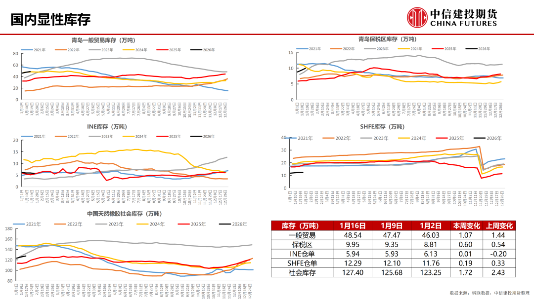 库存:截至2026年1月18日,中国天然橡胶社会库存127.3万吨,环比增加1.7万吨,增幅1.3%。中国深色胶社会总库存为85万吨,增1.7%。其中青岛现货库存增2.9%;云南降1%;越南10#降1.9%;NR库存小计增0.17%。中国浅色胶社会总库存为42.3万吨,环比增0.6%。其中老全乳胶环比降1.5%,3L环比增9%,RU库存小计增1.57%。