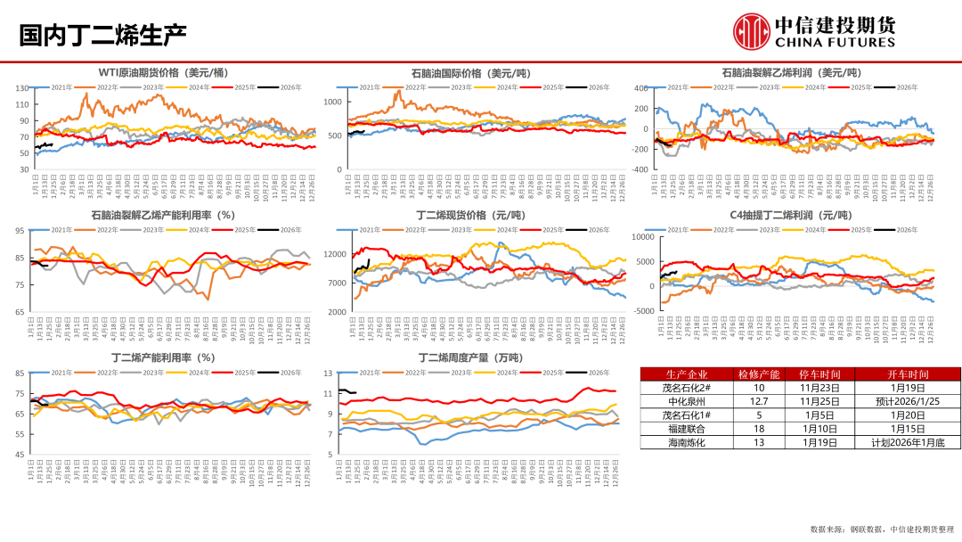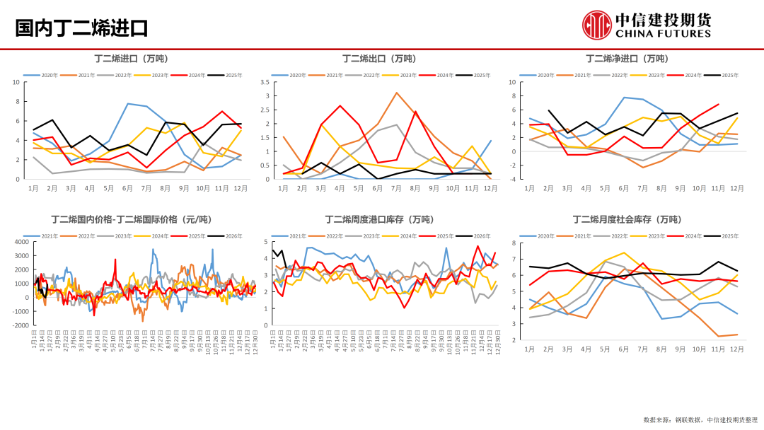 丁二烯:石脑油裂解制乙烯装置开工负荷为82.07%,环比上周持平,丁二烯装置开工负荷为69.45%,环比上周增加0.08%。本周丁二烯产量为11.06万吨,环比上周增加0.11%。本周,南京诚志、斯尔邦、燕山石化、上海石化一套、中化泉州石化等装置维持停车状态,茂名石化装置陆续重启,产量释放较为有限;本周,中石化丁二烯周均价格涨280元/吨至9600元/吨,主流市场价格小幅震荡上行,山东鲁中送到丁二烯周均价格在9705元/吨,环比涨0.83%;丁二烯中国CFR价格为1250美元/吨,环比上周上涨70美金/吨;本周,丁二烯内外价差924元/吨,内外价差扩大。截至1月21日,丁二烯华东港口最新库存在34500吨左右,较上周期大幅下降10100吨。周内进口船货到港有限,主力下游行业开工相对高位影响原料库存下降明显,影响样本港口库存大幅下降。