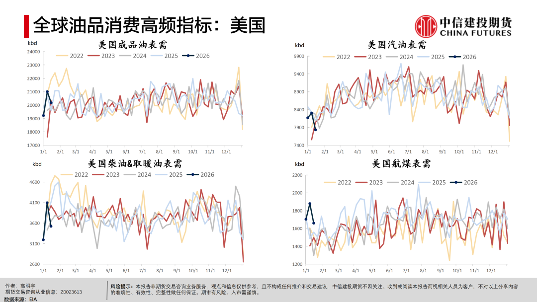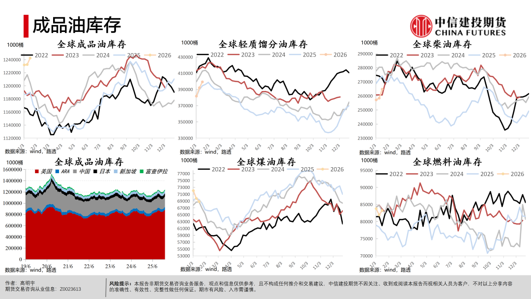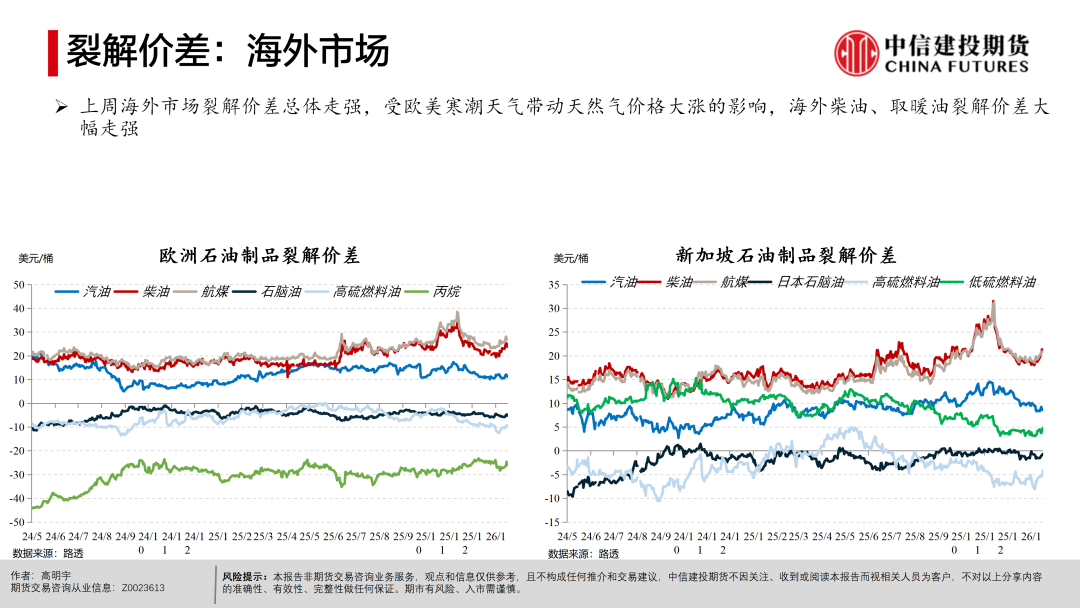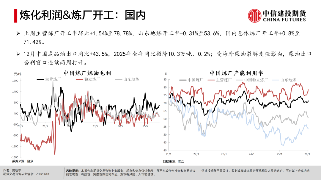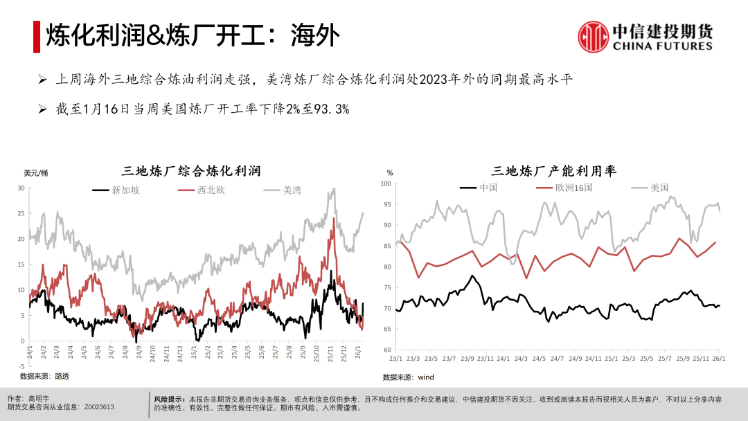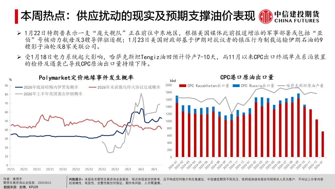 供应:截至1月16日当周美国原油产量1373.2万桶/天,近四周产量同比增1.9%,上周美国非墨西哥湾原油钻机数增加2台至403台,低位油价区间美国减产压力初步体现。近期供应端预期及现实层面均对油价构成短期支撑,一方面伊朗地缘风险经历了阶段性降温后近日再度回暖,美军包括“亚伯”号核动力航母及3艘导弹驱逐舰在内的战斗群组正在驶向中东,周五美国财政部发布新一轮针对伊朗镇压国内抗议者的油轮制裁,Polymarket定价上半年美国打击伊朗的概率回升至69%。另一方面受1月18日电力系统起火影响,哈萨克斯坦Tengiz油田预计停产7-10天,而11月以来CPC出口终端单点系泊装置的检修及遇袭已导致该港口原油出口量自10月的145.7万桶/天回落至1月的71.4万桶/天,轻质高硫油种实货市场受到支撑。
